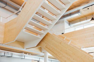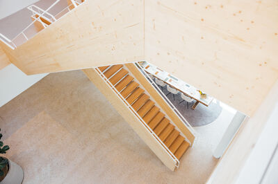 CLT is in het kantoor toegepast in alle verdiepingsvloeren, de trapbomen en de balustrades van het atrium. Het ruim opgezette atrium onderstreept het open karakter van het gebouw (en Houta) en benadrukt de zichtbaarheid van het hout.