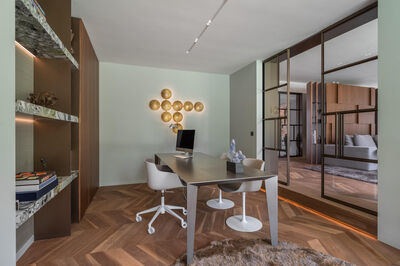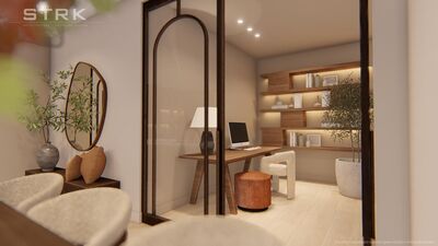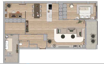 Het appartement 2 heeft de voordeur bij de centrale entree van het appartementen gebouw. Via de hal met meterkast en toilet heb je toegang tot de living van ruim 53 m2. De zitkamer ligt aan de voorzijde met toegang tot het terras / loggia van 8m2. Er is meer dan voldoende ruimte voor de keuken inrichting met een kook (schier) eiland en kastenwand met onder meer een inductie kookplaat met geïntegreerde afzuiging, vaatwasser, combimagnetron oven en een koel/vries-combinatie. Aansluitend aan de keuken is de eethoek met toegang tot de werkkamer. Deze heeft een glazen wand waardoor deze ruimte betrokken is bij de living. De slaapkamer ligt aan de voorzijde van het appartement. Via de entree hal is naast het toilet ook de badkamer bereikbaar. Deze is helemaal betegeld en heeft een ruime inloopdouche en een badkamermeubel met wastafel. Het terras aan de voorzijde heeft een doorzichtige balustrade.