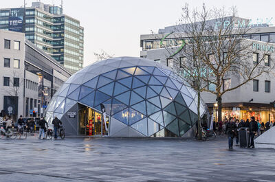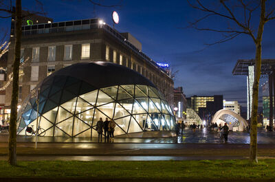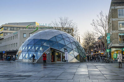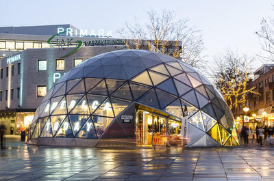 Deze bijzondere koepel met een driehoekige vlakverdeling van stalen kokerprofielen staat midden in het centrum van Eindhoven. Elementen van zes driehoeken met zes glasvlakken vormen de constructieve opbouw. Het licht in de drie bouwlagen komt vanuit een glazen lichtschacht in het midden van het gebouw. Ook is het gebouw volledig onder keldert De huid en constructie zijn tot één zelfdragende schil ontwikkeld, gesmeed uit glas en staal. Het staalskelet is ingevuld met ofwel een glasplaat ofwel een thermisch isolerende beglazing met groene tint. De verschillende glasvlakken worden onderbroeken door wigvormige entrees. Een bijzonder project dat Houta met veel kennis van zaken heeft opgeleverd.