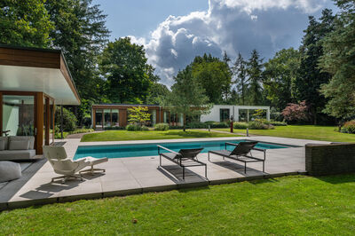 De buitenschil is vernieuwd met gevelisolatie en hoogwaardig gevelstucwerk. Alle kozijnen zijn vervangen, inclusief hoogrendementsbeglazing. Daarnaast zijn nieuwe gevelbetimmeringen aangebracht en is er een poolhouse gerealiseerd, uitgevoerd in dezelfde stijl en met materialen die terugkomen in de gevels van het woonhuis voor een krachtig, samenhangend totaalbeeld.